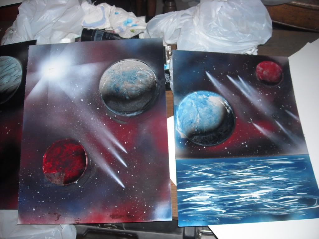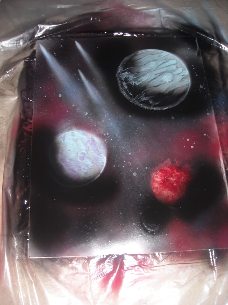 Spray paint art is generally a wet on wet paint technique, using materials to manipulate the textures. For the planets, I used magazine paper. The stars were an upside down can of white being sprayed really lightly, and the comets were quick sprays of white.