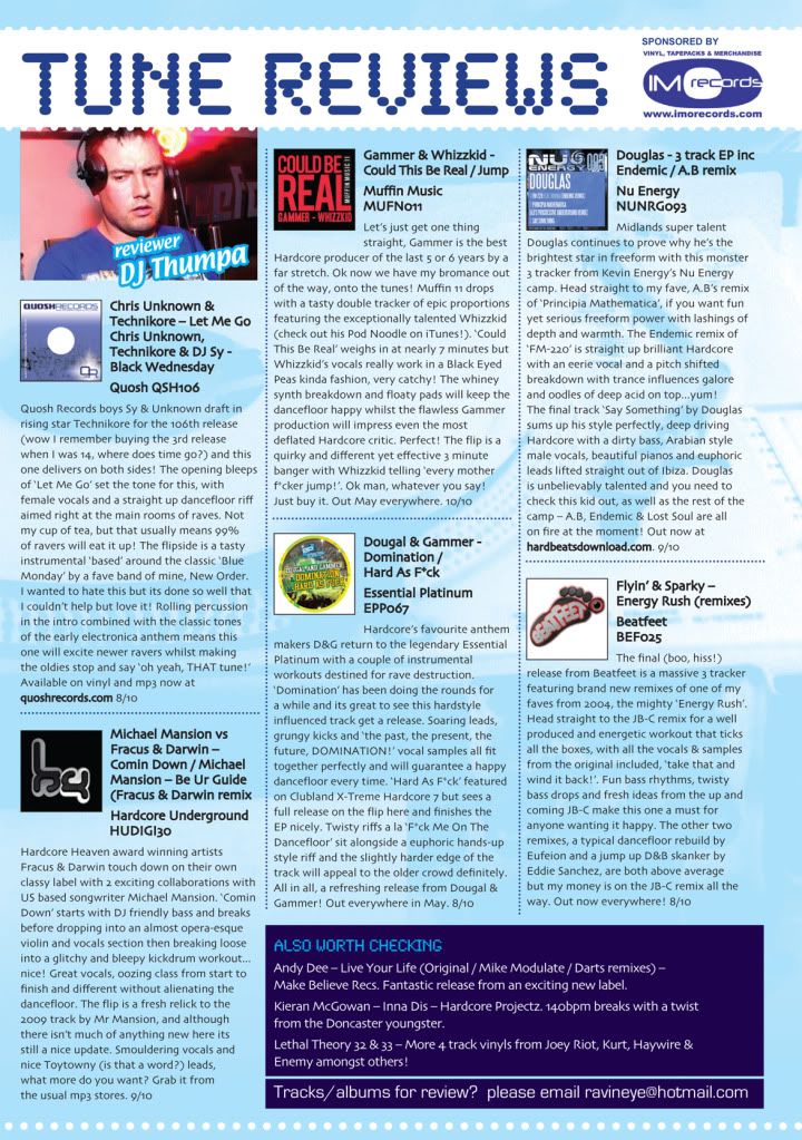 Once again I am doing the tune reviews for September's issue of Ravin Eye. Ravin Eye gets thousands of readers and hundreds of bedroom DJs so this is a great way to advertise your latest release or your label in general! The next issue is out 30th Sep and the deadline for my article is 17th Sep.